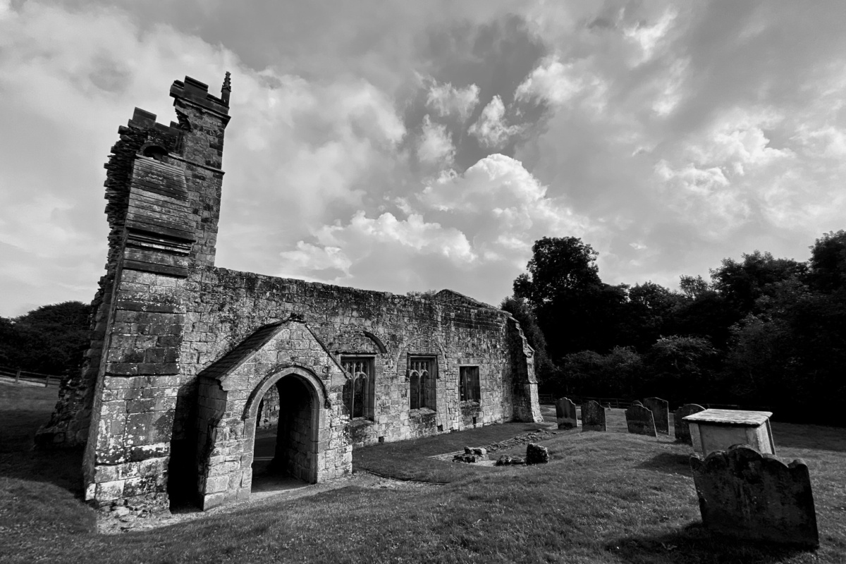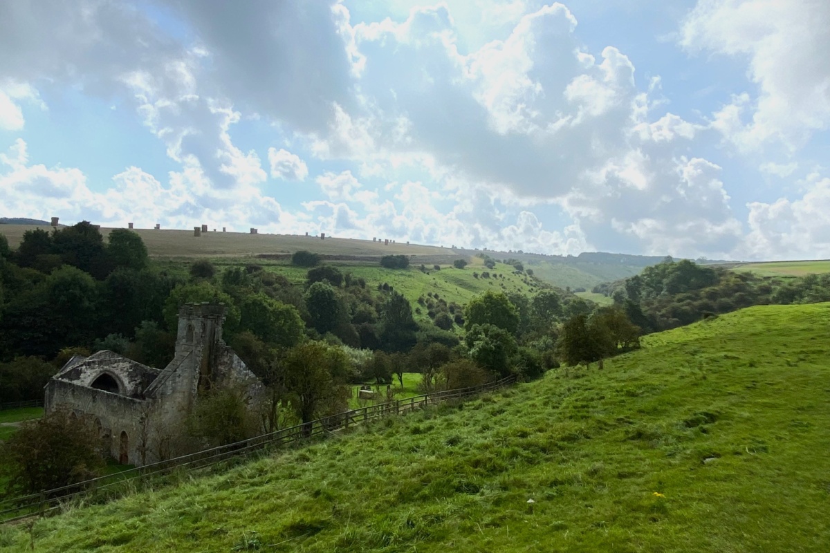 You come today to Wharram Percy down a mile-long chalk lane, inside high hedges, copses of woodland on the skyline. It’s autumn, so there are red haws and hips in great number. Under a broken wooden bridge, across a rail line long closed, up the steep slope.